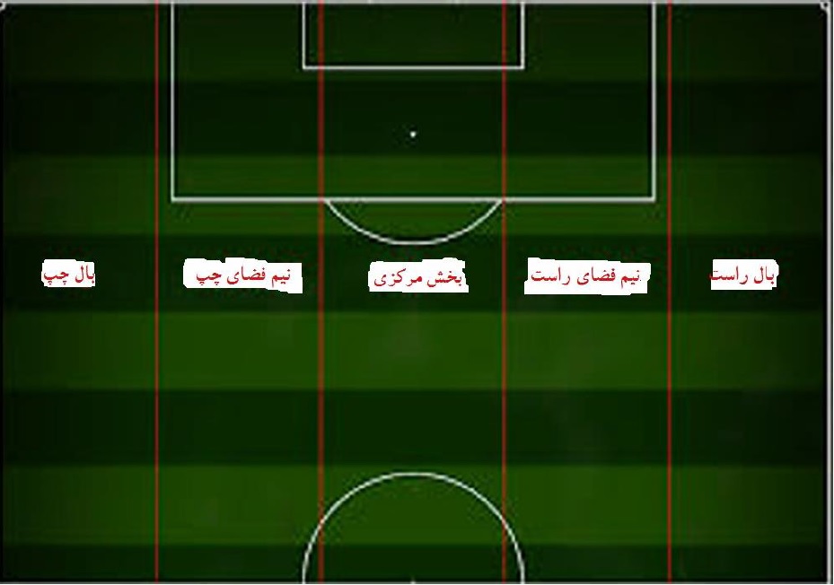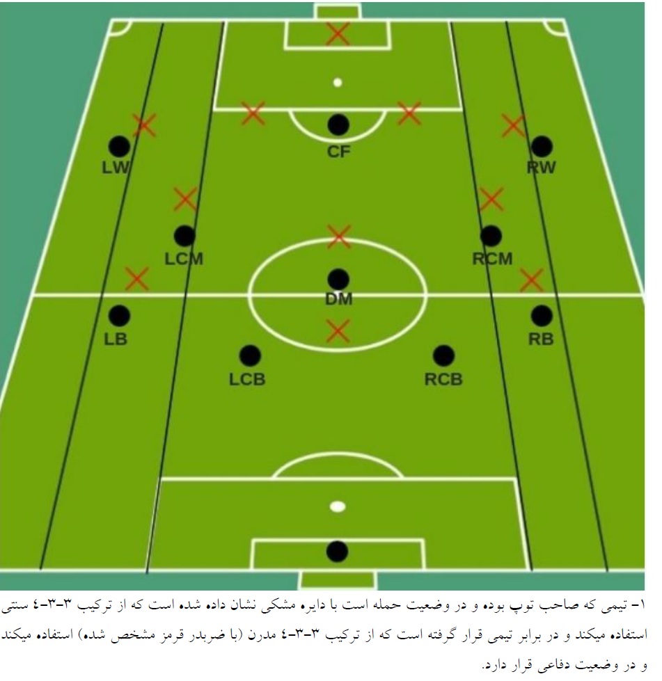 سیستم4.3.3درست مثل هر ورزشیدیگری،فوتبال نیز درطول سالها به طور قابل توجهی تکامل یافته است .از نقطه نظر صرفا تاکتیکی چنین حوزه کاملا ملموزی از تکامل در فوتبال میتوان و تکامل در اتحاز سیستم -های متمرکز برای مالکیت بیشتر توپ نسبت داد . همرا با چنین تکاملی در فوتبال ،یک نسخه پیشرفتهای از در3-3-4 مدرن ،نحوه قرار گیری در پست های خود،نقش بازی کنان و الگوی حمله کردن تیم متفاوتاز3-3-4سنتی است. با توجه به این نکته،در ادامهاین موضوع رابا جزیات بیشتری برسیکرده ومیخواهیم دیدکهچرا و چگونه این تغیرات صورت میگیرند وتا چه اندازه ای این تغیرات بر ورزش فوتبال تاثیرقبل از شروع مبحث اصلی لازم میدانم تا اصطلاح نیمه فضا یا haIf-spaseدر فوتبالرا که بارها در متن به ان اشاره خواهد شد خدمت دوستان عزیز با شکل زیر ملاحضه فرمایید.